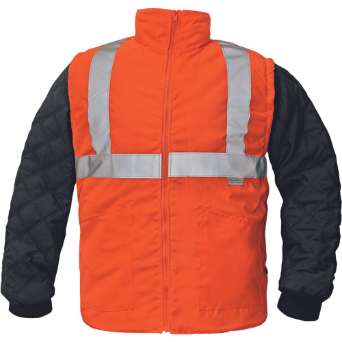 • bélelt jólláthatósági kabát 4 az egyben fényvisszavető csíkokkal • kivehető, külön is viselhető esőkabát, dzseki és mellény • gallérba hajtott kapucni • hegesztett varratok • vízálló • belső kötött mandzsetta