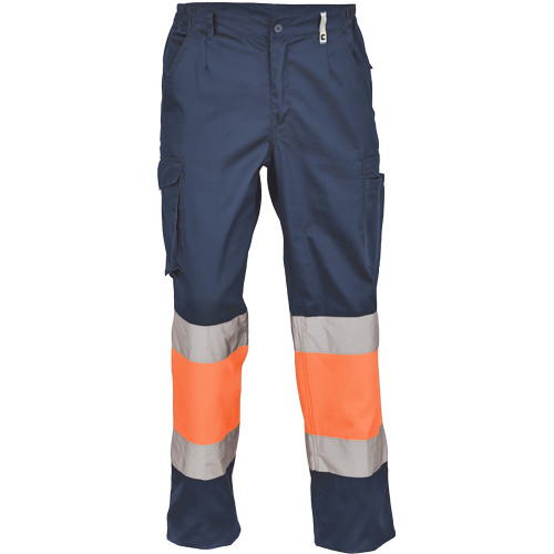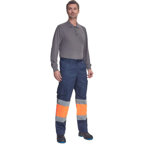 • férfi munkanadrág 7 cm széles fényvisszavető csíkokkal és Hi-Vis elemekkel • 2 első zseb + 1 érmezseb • 2 oldalzseb • 2 hátsó zseb • rugalmas oldalsó betétek a derékpánton • leengedhető szárak