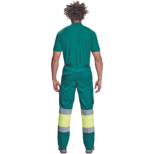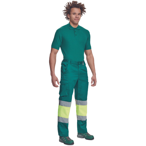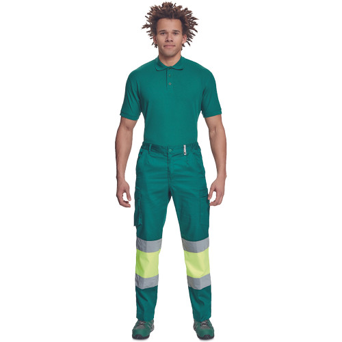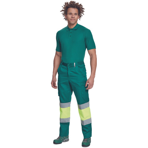 • férfi munkanadrág 7 cm széles fényvisszavető csíkokkal és Hi-Vis elemekkel • 2 első zseb + 1 érmezseb • 2 oldalzseb • 2 hátsó zseb • rugalmas oldalsó betétek a derékpánton • leengedhető szárak