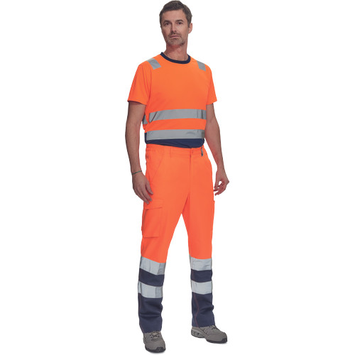 • férfi Hi-Vis munkanadrág 7 cm széles fényvisszavető csíkokkal • 2 első zseb + 1 érmezseb • 2 oldalzseb • 2 hátsó zseb • rugalmas oldalsó betétek a derékpánton • leengedhető szárak