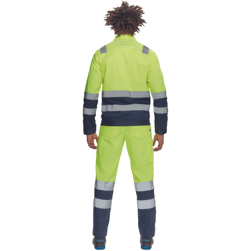 • férfi Hi-Vis munkanadrág 7 cm széles fényvisszavető csíkokkal • 2 első zseb + 1 érmezseb • 2 oldalzseb • 2 hátsó zseb • rugalmas oldalsó betétek a derékpánton • leengedhető szárak