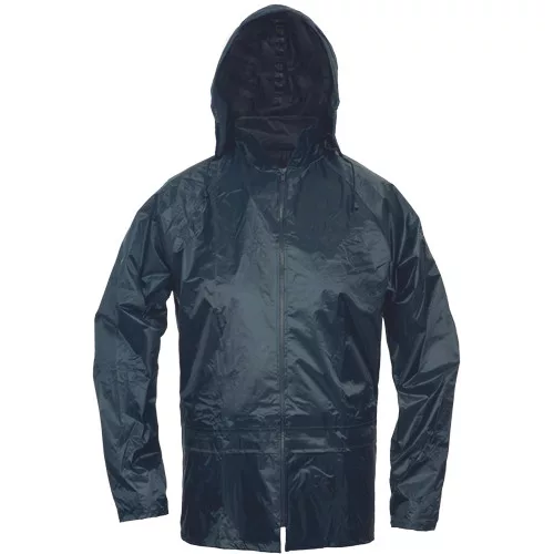Kétrészes esővédő öltöny csuklyával, lehegesztett varratokkal, praktikus tartóban.
