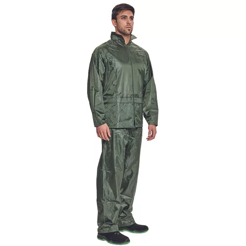 Kétrészes esővédő öltöny csuklyával, lehegesztett varratokkal, praktikus tartóban.