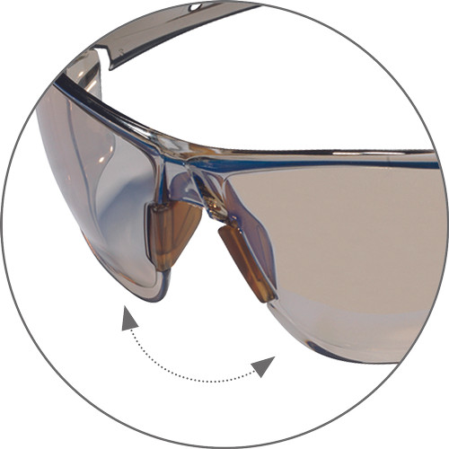 »Könnyű, 22 g-os védőszemüveg széles látómezővel, amely optimális kényelmet biztosít az egész napos viseléshez. Ívelt lencse, széles látómezővel, fejformát követő, csúszásmentes szár, állítható, csúszásmentes orr-rész, oldalirányú védelem.