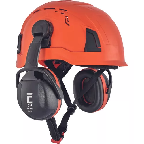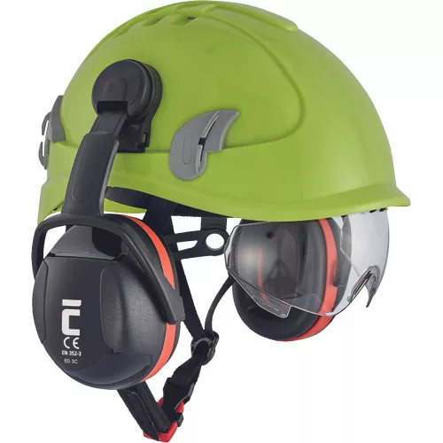 »Hallásvédő fültok védősisakhoz. Csatlakozója 30 mm-es. A magasságállító könnyen csúsztatható, megőrzi a beállítást. Puha fülpárnák a kényelemért. Kompakt forma, az elakadás veszélyének csökkentéséért, pl. szűk helyeken. SNR 32 dB, 300 g, EN 352-3:2002.