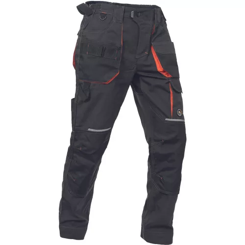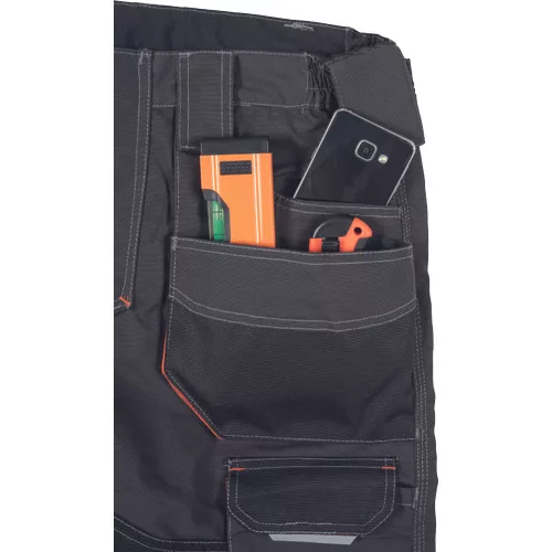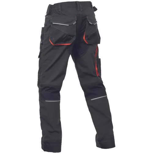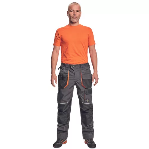 • férfi munkanadrág tágas zsebekkel • 2 szerszámtartó hurok • Oxford erősítés a térdnél és az igénybevett elemeknél • tartós hármas varrás • rugalmas derék, fényvisszavető elemek • az erősítéseken kontrasztos varratok • hosszabbítható szár