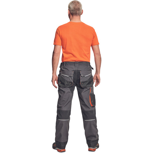 • férfi munkanadrág tágas zsebekkel • 2 szerszámtartó hurok • Oxford erősítés a térdnél és az igénybevett elemeknél • tartós hármas varrás • rugalmas derék, fényvisszavető elemek • az erősítéseken kontrasztos varratok • hosszabbítható szár