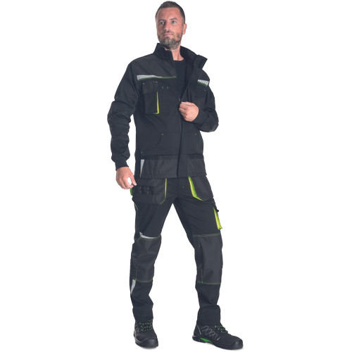 • férfi munkakabát, rendkívül tartós rugalmas anyagból • elöl cipzárral, védőfedéllel • 2 oldalzseb • 2 mellzseb, az egyik mobiltartó zsebbel • Oxford 600D megerősített váll- és könyökrészek • fényvisszavető elemek • kötött, elasztikus ujj mandzsetta