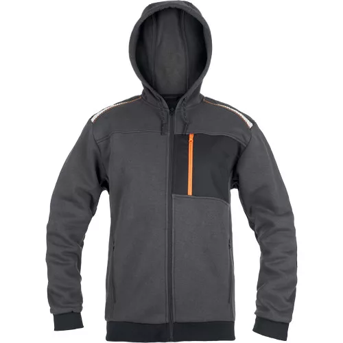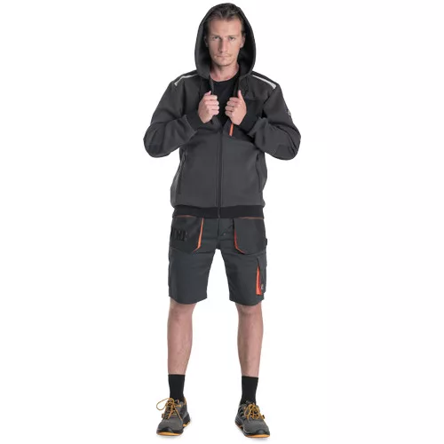 • férfi cipzáras kapucnis kardigán • 2 oldalzseb • 1 mellzseb cipzárral • megerősített vállrészek fényvisszavető csíkokkal • rugalmas derékpánt és mandzsetta