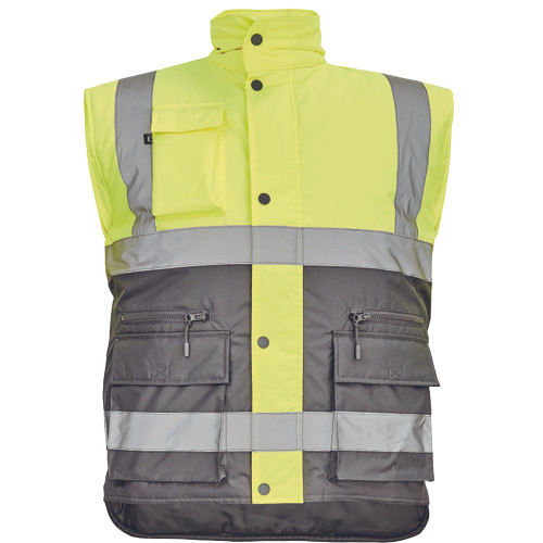 • Hi-Vis bélelt férfi mellény, gallérba rejtett kapucnival • 5 cm széles fényvisszavető csíkok • patentos hajtókával fedett cipzáras kialakítás