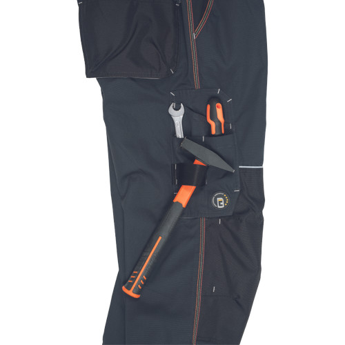 • férfi mellesnadrág rugalmas derékkal és kantárral, multifunkcionális zsebekkel • 1 nagy mellzseb • megerősített térdrész és térdzseb Oxford 600D anyagból térdvédő behelyezéséhez • fényvisszavető díszítés • leengedhető szárak