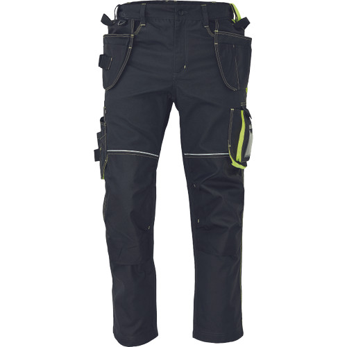 • férfi munkanadrág rugalmas derékkal • 2 oldalsó zseb, 2 repülőzseb szerszámtartó hurokkal, 1 átlátszó zseb az igazolvány számára, D-gyűrű • 2 hátsózseb • kalapácstartó kontrasztos színben • megerősített térdrész, térdvédőtartó • 5 cm-rel meghosszabbítható nadrágszárak • a nadrágszár hátsó, alsó része megerősített • dekoratív, figyelemfelkeltő varrás színes cérnával