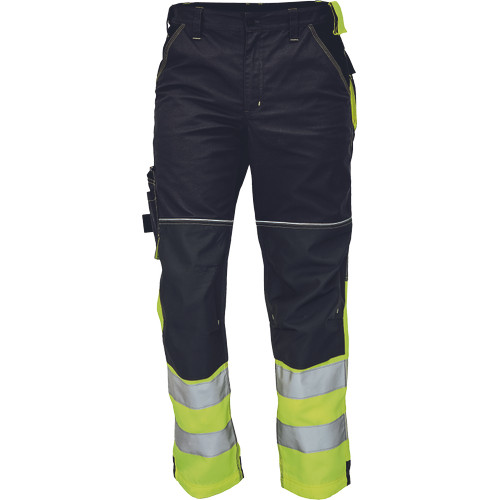 • férfi nadrág jólláthatósági kivitelben a szárak alján két fényvisszavető csíkkal • rugalmas derék • 2 oldalzseb • multifunkciós zseb a jobb lábon • D-gyűrű • hátul 2 zsebfedős zseb • kontrasztos kalapácstartó • megerősített térdrész, térdvédőtartó • 5 cm-rel bővíthető hossz • a nadrágszár hátsó, alsó része megerősített • kontrasztos, jól látható varratok