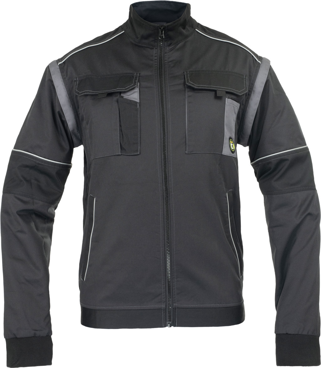 • férfi munkakabát cipzárral, takart patentes borítással • 2 oldalzseb • 2 tépőzáras mellzseb • megerősített vállrészek • levehető ujjak rugalmas mandzsettákkal • rugalmas derékpánt • fényvisszavető részletek
