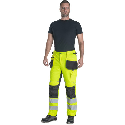 • men's HI-VIS working pants with an elastic waistband • 2 multifunctional flying pockets • 2 printed 7.5 cm wide reflective stripes on bottom legs • Oxford 600D reinforcement at knee areas with optional knee pad insertions • adjustable leg length