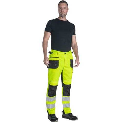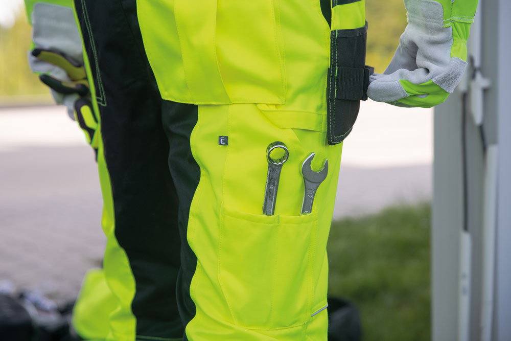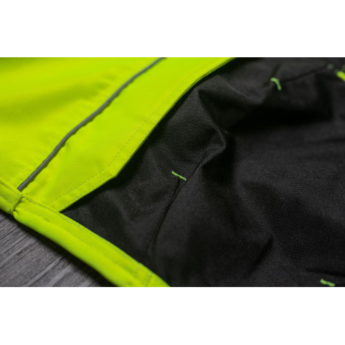 • men's HI-VIS working pants with an elastic waistband • 2 multifunctional flying pockets • 2 printed 7.5 cm wide reflective stripes on bottom legs • Oxford 600D reinforcement at knee areas with optional knee pad insertions • adjustable leg length
