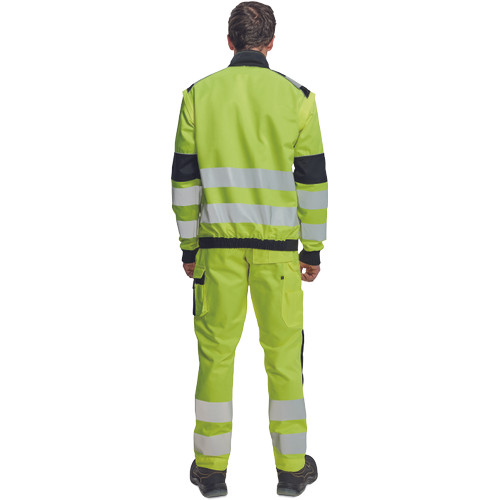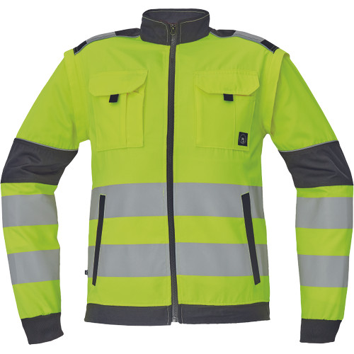 • férfi HI-VIS cipzáras munkakabát levehető ujjakkal • 2 oldalzseb • 2 mellzseb • Oxford 600D megerősítés a váll-és könyökrészeken • 7 cm-es nyomtatott fényvisszavető csík az ujjakon és a test körül derékrészen • rugalmas mandzsetta és alsó szegély • 2 kisebb fényvisszavető csík a vállakon • fényvisszavető szegés