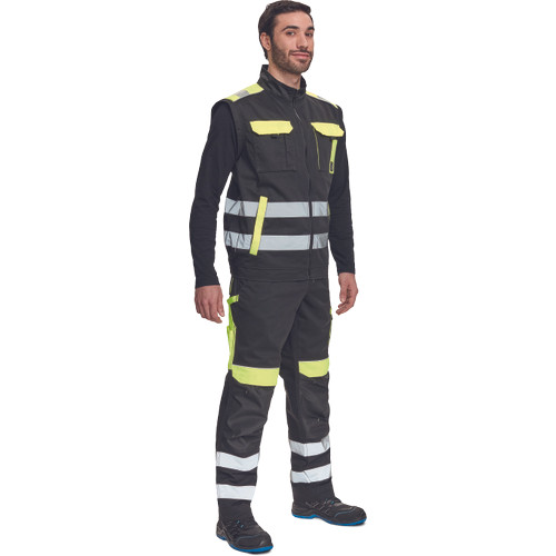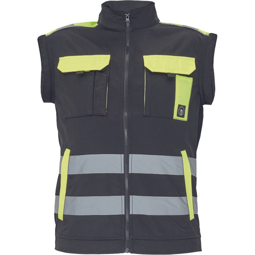 • cipzáras férfi munkakabát, levehető ujjakkal • 2 oldalzsebbel, 2 mellzsebbel készül, a a váll- és a könyökrészen megerősítő rátétekkel • rugalmas mandzsetta és alsó szegély • derékrészen, az ujjakon és a vállakon rávarrt fényvisszavető csíkokkal