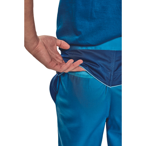 • férfi munkanadrág könnyű pamut-PES kevertszálas anyagból • dekoratív paszpol kontrasztos színekkel • hálós betétek • zsebfedős zsebek • a derékbőség tépőzárral állítható • 5 cm-rel leengedhető szárak • 2 első zseb, az egyikben D-gyűrű található • 1 hátsó zseb •tartós anyagú • puhább, hajlékonyabb szövet