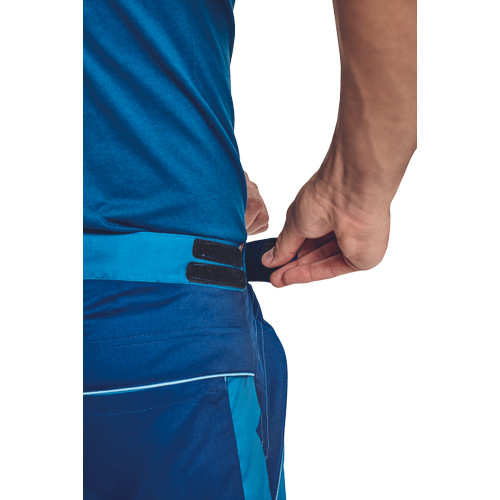• férfi munkanadrág könnyű pamut-PES kevertszálas anyagból • dekoratív paszpol kontrasztos színekkel • hálós betétek • zsebfedős zsebek • a derékbőség tépőzárral állítható • 5 cm-rel leengedhető szárak • 2 első zseb, az egyikben D-gyűrű található • 1 hátsó zseb •tartós anyagú • puhább, hajlékonyabb szövet