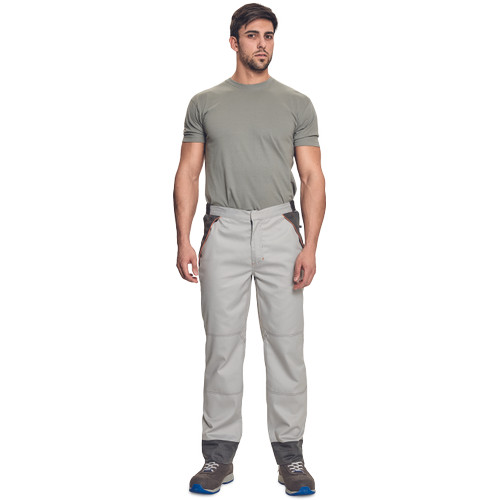• férfi munkanadrág könnyű pamut-PES kevertszálas anyagból • dekoratív paszpol kontrasztos színekkel • hálós betétek • zsebfedős zsebek • a derékbőség tépőzárral állítható • 5 cm-rel leengedhető szárak • 2 első zseb, az egyikben D-gyűrű található • 1 hátsó zseb •tartós anyagú • puhább, hajlékonyabb szövet