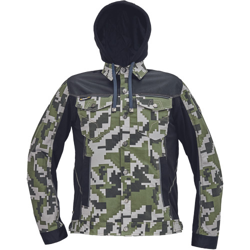 • férfi munkakabát férfi munkakabát innovatív, pamutgazdag, rugalmas TRIFIBETEX, illetve TRIFIBETEXPRO® anyagokból CORDURA® betétekkel, digitális terepmintával, fém gombok, állítható ujjvégek, 2 oldalsó zseb, 2 cipzáras mellkasi zseb, fényvisszavető csíkok