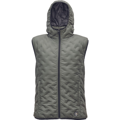 Markáns vonalvezetésű, tollpehely bélésű, cipzáras mellény kapucnival. Modern kialakítású, kényelmesen feszülő vonalainak köszönhetően stílusos megjelenést kölcsönöz. Gumírozott derékrésszel és két mély, cipzárral záródó oldalzsebbel készül. Anyaga 100% poliészter. Bélés 100 % poliészter, 70 g/m², taffeta. Töltőanyag: 905 tollpehely, 10% toll.