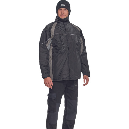 • bélelt, vízálló kabát gallérba hajtott kapucnival • külső szövet kopásállóságot növelő kezeléssel • húzózsinórral szűkíthető alsó szegély • fényvisszavető részletek