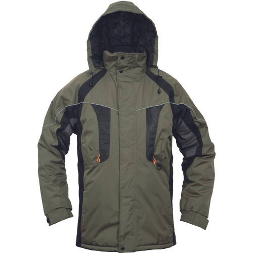 • bélelt, vízálló kabát gallérba hajtott kapucnival • külső szövet kopásállóságot növelő kezeléssel • húzózsinórral szűkíthető alsó szegély • fényvisszavető részletek