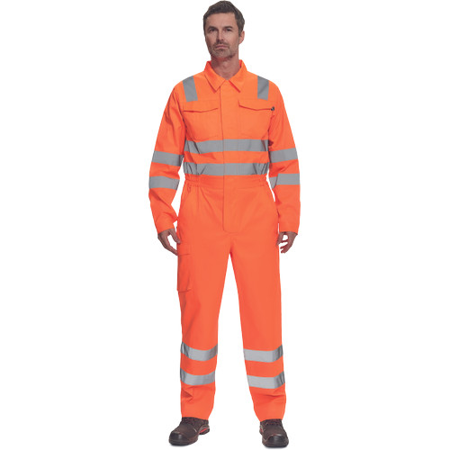 • férfi Hi-Vis overall 5 cm széles fényvisszavető csíkokkal • hajtókával fedett cipzár • 2 első zseb, 1 érmezseb • 1 multifunkciós oldalzseb a száron • 2 hátsó zseb • 2 zsebfedős mellzseb • rugalmas betét a derékrészen • leengedhető szárak