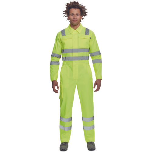 • férfi Hi-Vis overall 5 cm széles fényvisszavető csíkokkal • hajtókával fedett cipzár • 2 első zseb, 1 érmezseb • 1 multifunkciós oldalzseb a száron • 2 hátsó zseb • 2 zsebfedős mellzseb • rugalmas betét a derékrészen • leengedhető szárak