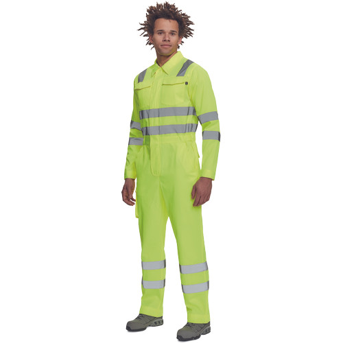 • férfi Hi-Vis overall 5 cm széles fényvisszavető csíkokkal • hajtókával fedett cipzár • 2 első zseb, 1 érmezseb • 1 multifunkciós oldalzseb a száron • 2 hátsó zseb • 2 zsebfedős mellzseb • rugalmas betét a derékrészen • leengedhető szárak