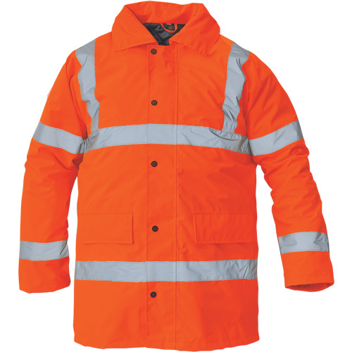 • jólláthatósági bélelt vízálló kabát fényvisszavető csíkokkal: EN 471: 3,2 • gallérba hajtott kapucnival, húzózsinórral • belső kötött mandzsetta • vízállóság 3. osztály és lélegzőképesség 1. osztály az EN 343 szabvány szerint