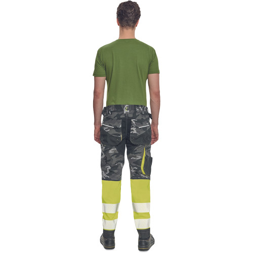 • férfi jólláthatósági nadrág rugalmas derékkal és többfunkciós zsebekkel, fényvisszavető elemekkel és 7 cm-es szegmentált fényvisszavető csíkokkal • megerősített térdrész és térdzseb Oxford 600D anyagból térdvédő behelyezéséhez • ellenálló hármas fedőző varrás az üleprészen és a meghosszabítható szárakon • modern terepminta