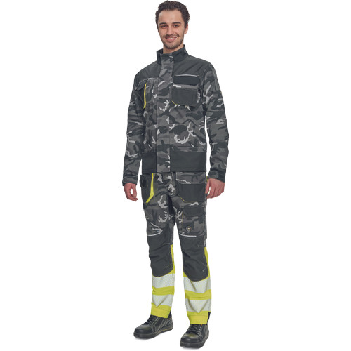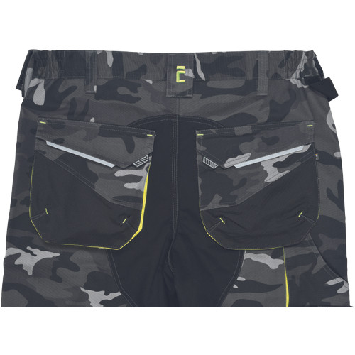 • férfi jólláthatósági nadrág rugalmas derékkal és többfunkciós zsebekkel, fényvisszavető elemekkel és 7 cm-es szegmentált fényvisszavető csíkokkal • megerősített térdrész és térdzseb Oxford 600D anyagból térdvédő behelyezéséhez • ellenálló hármas fedőző varrás az üleprészen és a meghosszabítható szárakon • modern terepminta