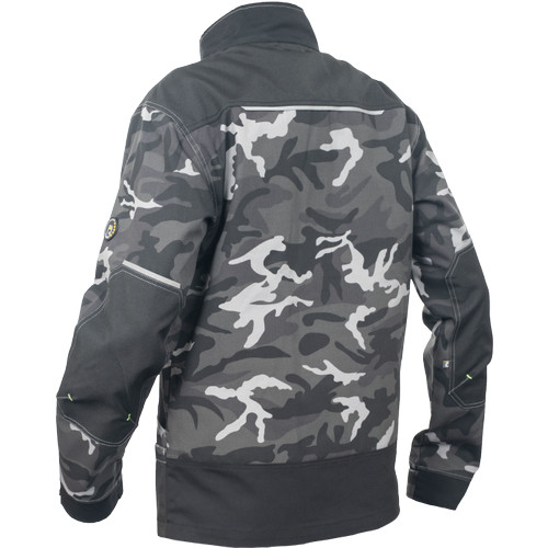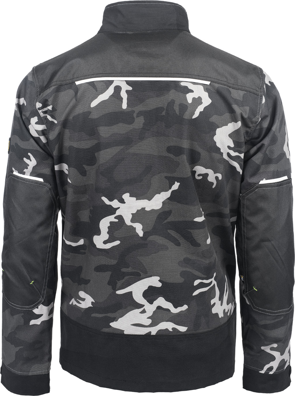 • férfi munkakabát • cipzárral záródó kabát tépőzáras hajtókával • Oxford 600D megerősítő rátétekkel a váll-és könyökrészeken • 2-2 oldal - és mellzsebbel, 1 e-Secure anyagból készült telefontartó zsebbel • fényvisszavető elemek, kontrasztos tűzés • modern terepminta