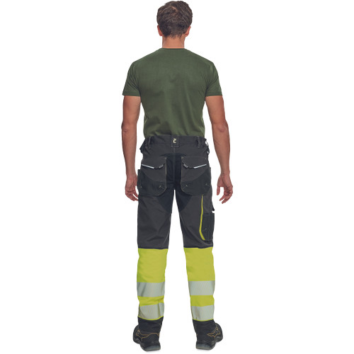 • Férfi jólláthatósági nadrág rugalmas derékkal és többfunkciós zsebekkel, 7 cm-es szegmentált fényvisszavető csíkokkal. Megerősített térdrész és térdzseb Oxford 600D anyagból térdvédő behelyezéséhez. Ellenálló hármas fedőző varrás az üleprészen és a meghosszabbítható szárakon.