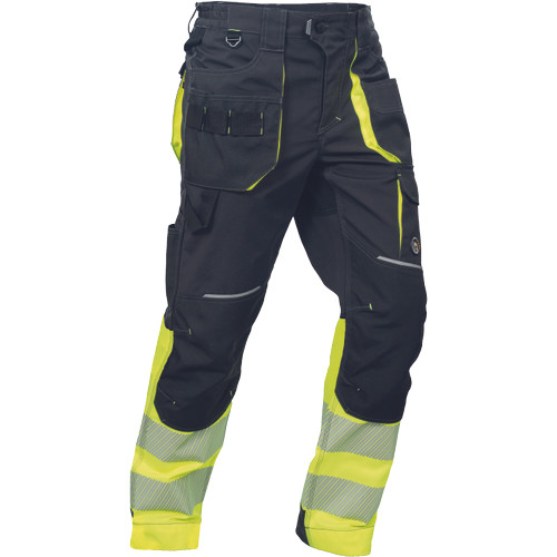 • Férfi jólláthatósági nadrág rugalmas derékkal és többfunkciós zsebekkel, 7 cm-es szegmentált fényvisszavető csíkokkal. Megerősített térdrész és térdzseb Oxford 600D anyagból térdvédő behelyezéséhez. Ellenálló hármas fedőző varrás az üleprészen és a meghosszabbítható szárakon.