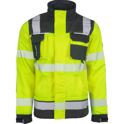 • férfi jólláthatósági munkakabát • cipzárral záródó kialakítás tépőzáras hajtókával, Oxford 600D megerősítő rátétekkel a váll-és könyökrészeken • 2-2 oldal - és mellzsebbel, 1 e-Secure anyagból készült telefontartó zsebbel • fényvisszavető részletekkel • 5 cm -es fényvisszavető csíkokkal a derékrészen, az ujjakon és a vállakon