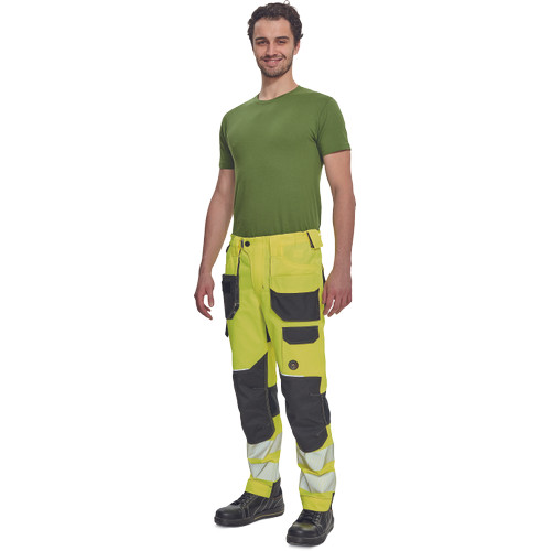 • férfi jólláthatósági nadrág rugalmas derékkal és többfunkciós zsebekkel, 7 cm-es nyomtatott fényvisszavető csíkokkal • megerősített térdrész és térdzseb Oxford 600D anyagból térdvédő behelyezéséhez • ellenálló hármas fedőző varrás az üleprészen és a meghosszabbítható szárakon