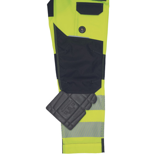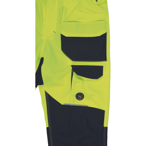 • férfi jólláthatósági nadrág rugalmas derékkal és többfunkciós zsebekkel, 7 cm-es nyomtatott fényvisszavető csíkokkal • megerősített térdrész és térdzseb Oxford 600D anyagból térdvédő behelyezéséhez • ellenálló hármas fedőző varrás az üleprészen és a meghosszabbítható szárakon