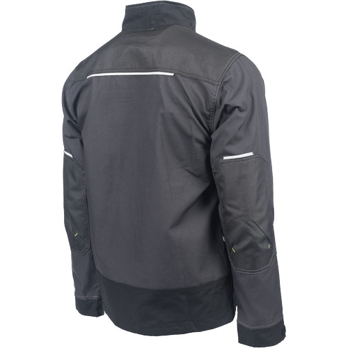Férfi munkakabát. Cipzárral záródó kabát tépőzáras hajtókával, Oxford 600D megerősítő rátétekkel a váll-és könyökrészeken. 2-2 oldal - és mellzsebbel, 1 e-Secure anyagból készült telefontartó zsebbel. Fényvisszavető elemekkel, kontrasztos varrással.