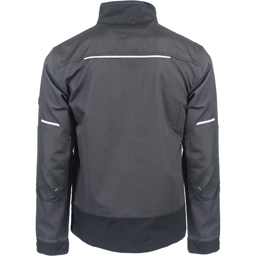 Férfi munkakabát. Cipzárral záródó kabát tépőzáras hajtókával, Oxford 600D megerősítő rátétekkel a váll-és könyökrészeken. 2-2 oldal - és mellzsebbel, 1 e-Secure anyagból készült telefontartó zsebbel. Fényvisszavető elemekkel, kontrasztos varrással.