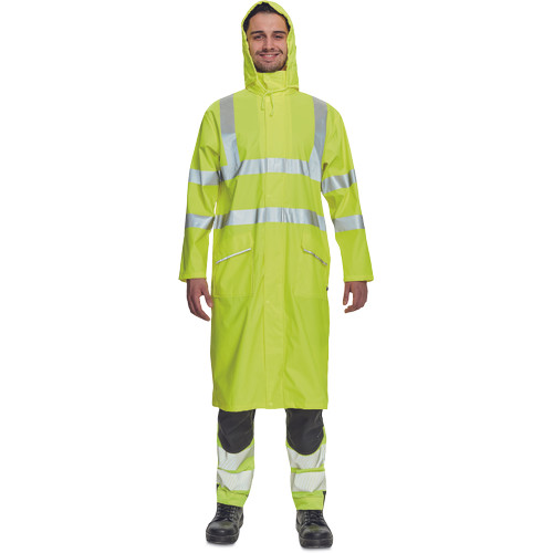 • víz-és szélálló, bő szabású esőköpeny gallérba hajtott kapucnival • hossza: 120 cm • húzózsinórral állítható kapucnival • 2 mély zsebfedős oldalzseb • patenttal szűkíthető mandzsetták • fényvisszavető csíkok az ujjakon, a vállakon és a test körül