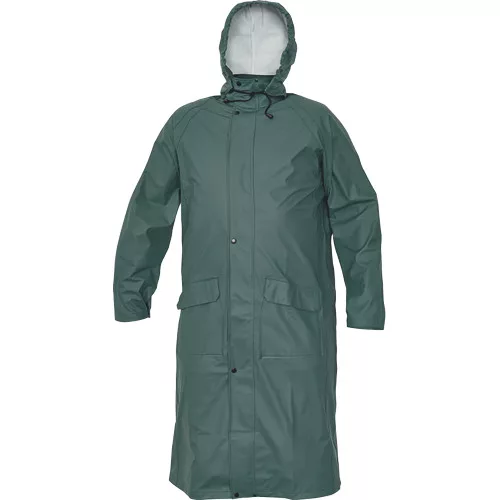 • víz-és szélálló, bő szabású esőköpeny gallérba hajtott kapucnival • hossza: 120 cm • húzózsinórral állítható kapucnival • 2 mély zsebfedős oldalzseb • patenttal szűkíthető mandzsetták