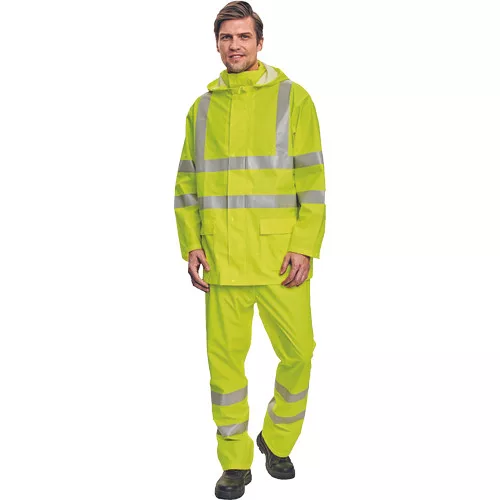 • esőkabát gallérba hajtott kapucnival és rugalmas derekú nadrággal • puha poliészter szövet • 2 mély zsebfedős oldalzseb • patenttal szűkíthető mandzsetták • fényvisszavető csíkok az ujjakon, a vállakon és a test körül