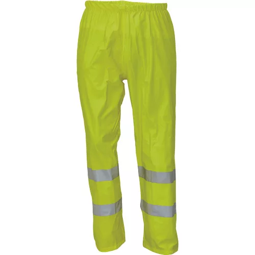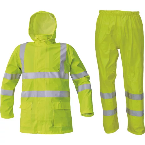 • esőkabát gallérba hajtott kapucnival és rugalmas derekú nadrággal • puha poliészter szövet • 2 mély zsebfedős oldalzseb • patenttal szűkíthető mandzsetták • fényvisszavető csíkok az ujjakon, a vállakon és a test körül