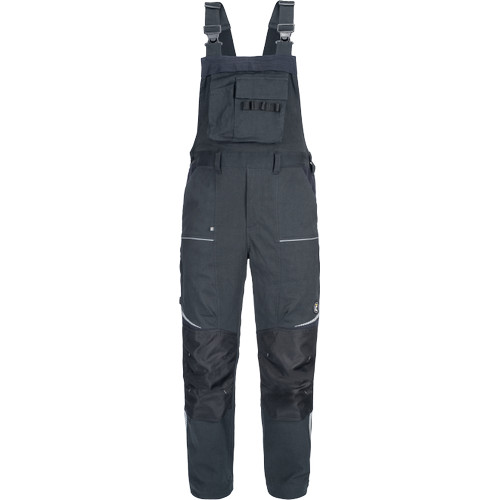 • men's working bip pants made of stretch fabric • elastic waistband with belt loops • 2 front pockets, 2 back pockets • 2 zipped thigh mesh ventilating pockets • 1 right side multifunctional pocket • 1 multifunctional chest pocket • reinforced knee parts for insertion of knee pads • reflective piping and printed details • legs extendable by 5 cm
