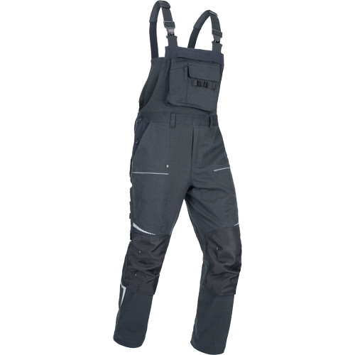 • men's working bip pants made of stretch fabric • elastic waistband with belt loops • 2 front pockets, 2 back pockets • 2 zipped thigh mesh ventilating pockets • 1 right side multifunctional pocket • 1 multifunctional chest pocket • reinforced knee parts for insertion of knee pads • reflective piping and printed details • legs extendable by 5 cm