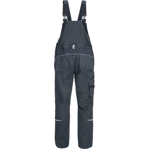 • men's working bip pants made of stretch fabric • elastic waistband with belt loops • 2 front pockets, 2 back pockets • 2 zipped thigh mesh ventilating pockets • 1 right side multifunctional pocket • 1 multifunctional chest pocket • reinforced knee parts for insertion of knee pads • reflective piping and printed details • legs extendable by 5 cm